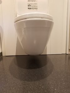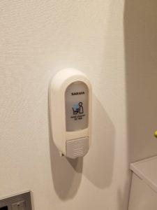 すべてのトイレは清掃のしやすさに配慮して、床から浮いている壁掛け式を採用。便座消毒用アルコール、音姫も完備です。