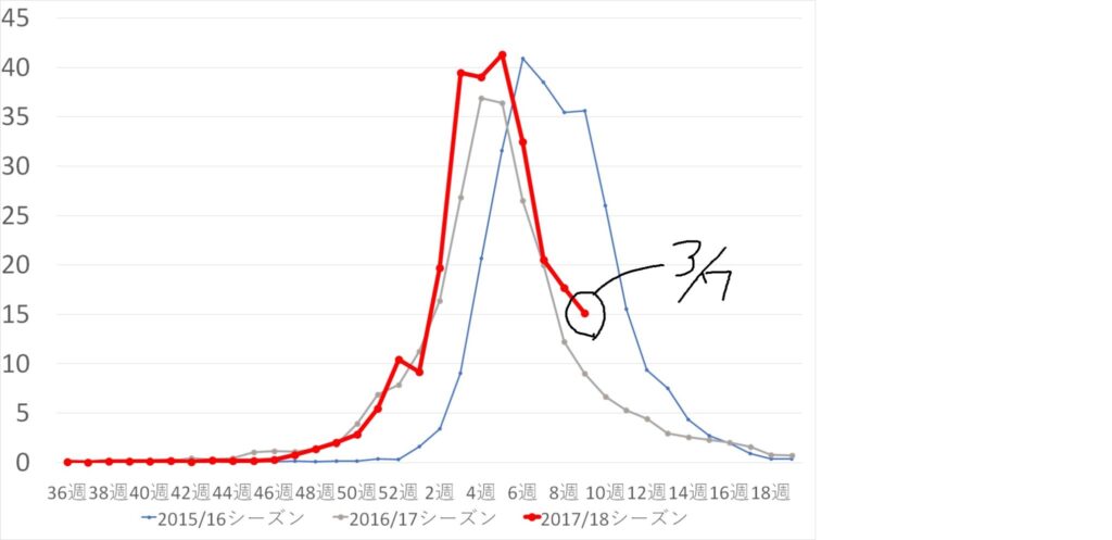 3/7時点ではじわじわと減少傾向にはありますが、流行っているところは局地的に流行ってますね。