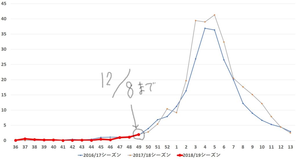 グラフ上は名古屋市はまだ10人以下ではありますが、当院でも昨日はインフルエンザA型が三人出ております。