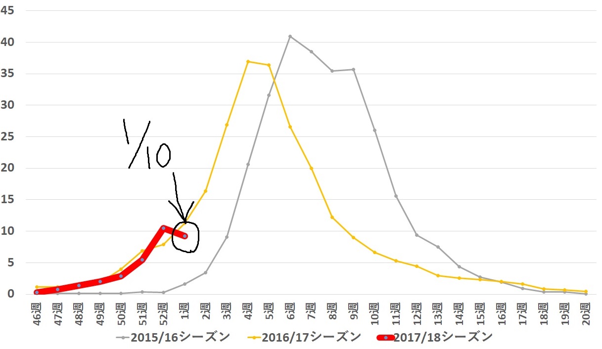 テラッセ納屋橋ファミリークリニック院長の近藤です。 今日は恒例のインフルエンザ定点観測シリーズです。 赤いグラフが今シーズンのグ…